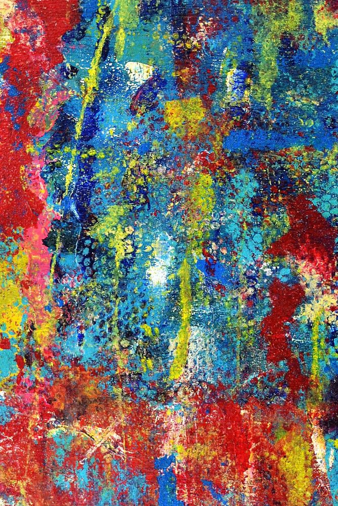 Abstract painting by artist Freek van der Hoeve. Abstrcat expressionism with red, yellow, blue, white, many stripes, shapes and dots.