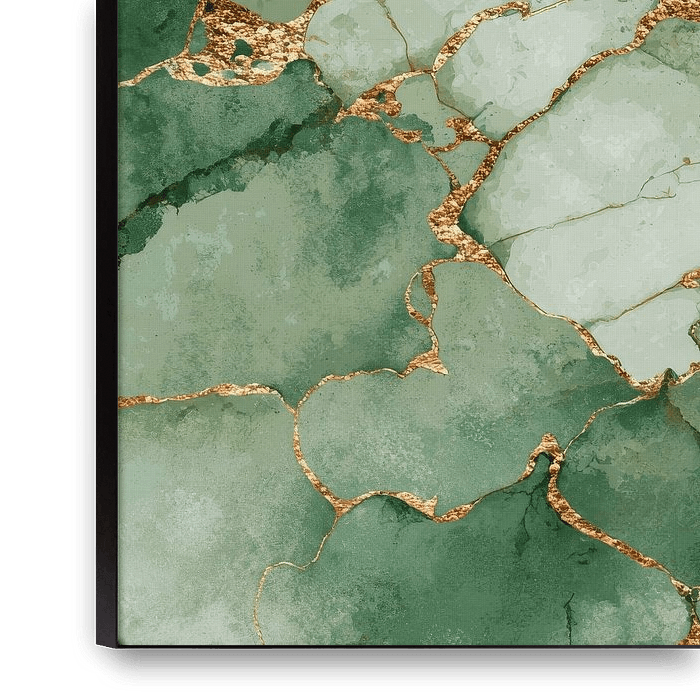 This elegant abstract artwork combines soft green tones with warm beige and cream nuances, refined with luxurious gold accents. The organic shapes and flowing colour transitions are reminiscent of marble or agate, with the gold lines flowing through the surface like delicate veins. The transparent layers and subtle textures create a…
