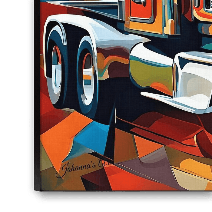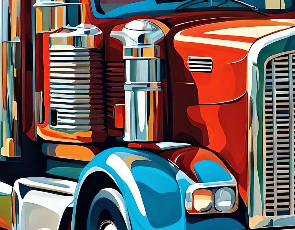 A vibrantly colored semi-truck is depicted in a stylized, geometric manner, with sharp angles and contrasting hues highlighting its features. The use of bold reds, blues, and yellows gives the image a dynamic and lively feel, underscoring the power and energy typically associated with such vehicles.