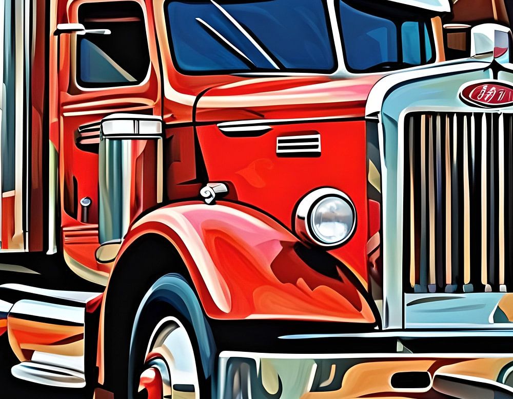 A vibrant red classic semi-truck is prominently framed against a background of abstract geometric shapes. The bold colors and exaggerated lines give the piece a dynamic, almost three-dimensional look.