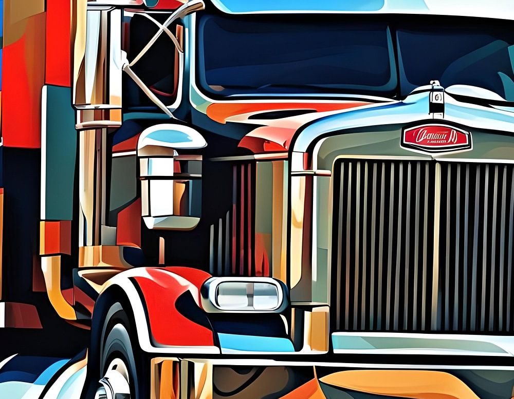A brightly colored semi-truck is depicted in a stylized, geometric form, exuding a bold, modern vibe. The truck is shown from a slight low-angle front view, providing a sense of strength and size.