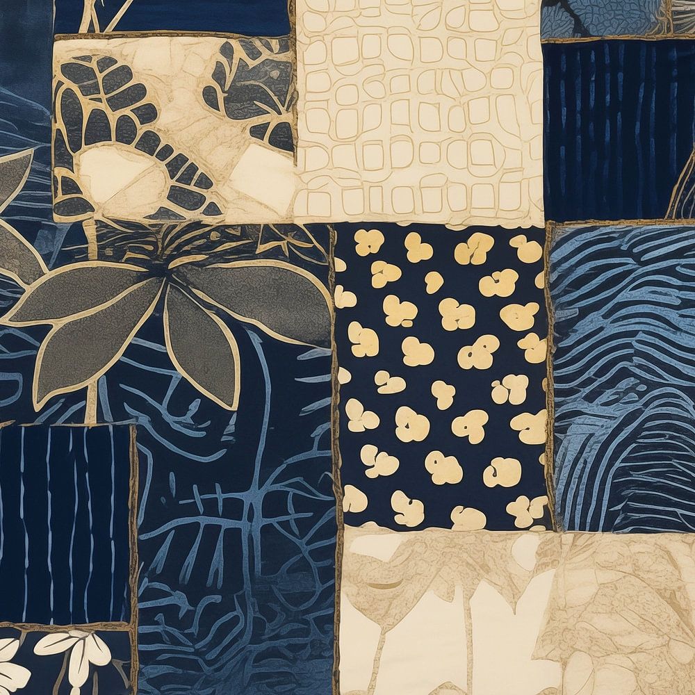 The dark and light shades of blue, combined with beige and cream accents, bring a sense of depth and contrast. Floral and organic motifs mingle with abstract geometric shapes, creating a dynamic yet balanced composition.