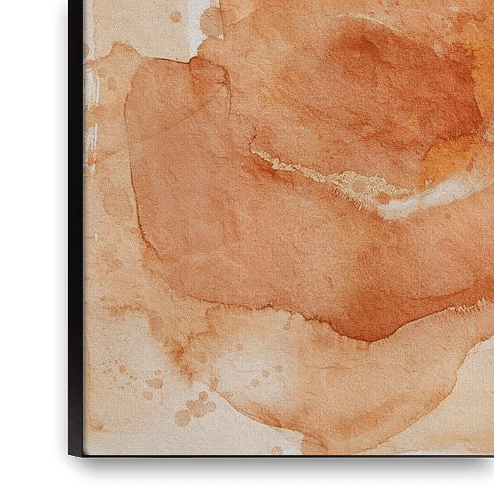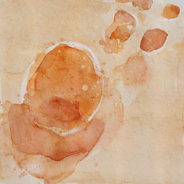 Abstract Brilliance II This abstract watercolour painting features a soft composition of organic shapes and transparent layers in warm Tangerine Twist tones: citrus orange, terracotta, caramel and sandy hues. A large, flowing shape is framed by a light, almost white border, while small splashes of colour in the top right corner create…