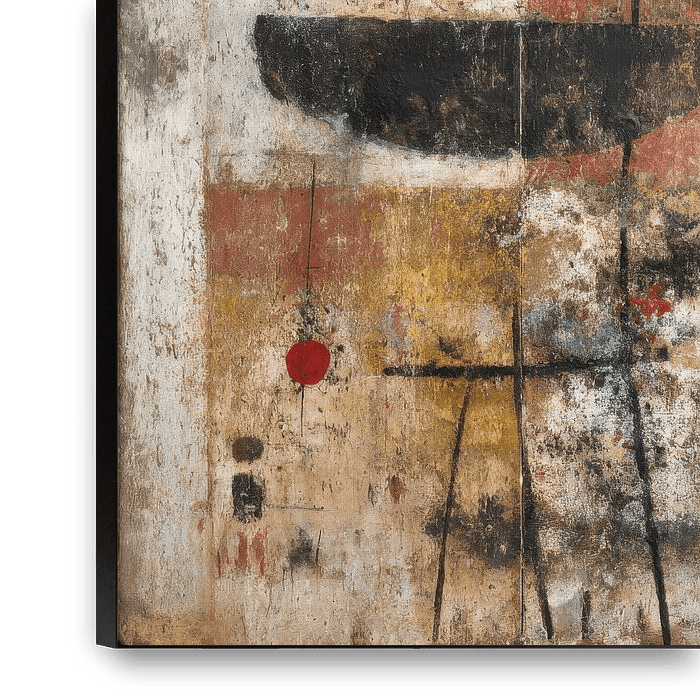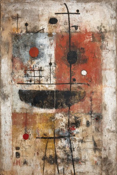 The colours — red, ochre, blue and off-white — create an earthy, timeless atmosphere. The work brings tranquillity through its structure, yet liveliness through the playful symbols. Ideal for anyone wishing to enrich their interior with art that feels both modern and personal. The atmosphere is warm, earthy and modern. The piece brings a sense of calm through its structure, yet also energy through the contrasting circles and the rhythm of the lines. It fits beautifully in spaces where you want to create a sense of balance, depth and character.