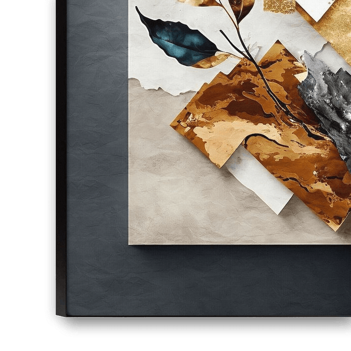 Collage with graphic and organic shapes on coarse paper. Abstract Mixed media in mainly grey, white,brown and gold tones.