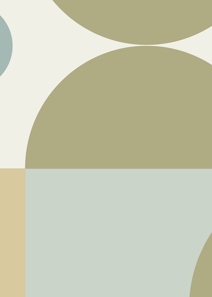 Abstract geometric Japandi artwork with arc and circle in green, beige, ivory, off-white, Scandinavia blue and sage green colors on an ivory background.