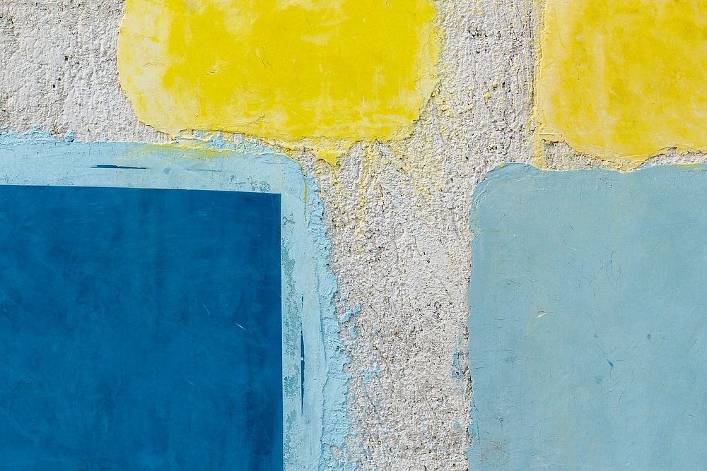 A photo of a wall with abstract blue and yellow geometric shapes. This photo was taken in Mexico, where you can find many colorful walls.