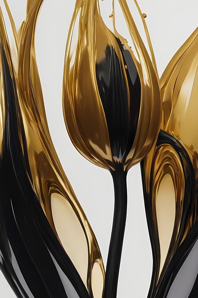 Discover the elegant beauty of this abstract interpretation of tulips, fused into a monochrome symphony of gold and black. Each curve and line of the flowers is styled with a modernist flair, creating a powerful visual impact. This piece would be a striking addition to any modern, minimalist décor, while still maintaining a timeless appeal. The use of gold highlights gives a luxurious and sophisticated look that will continue to captivate and inspire the viewer, while enhancing the deep contrasts and intriguing detail of this design.
