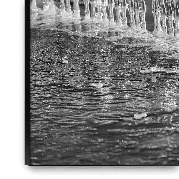This photograph shows an intriguing scene of barbed wire decorated with frozen icicles. The icy structures hang gracefully along the barbed wire, while the background consists of a restless water surface. The sharp textures of the ice contrast nicely with the softer wave patterns of the water. The black-and-white composition enhances…