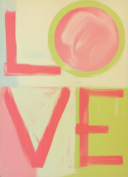 This abstract composition combines striking geometric shapes with a vibrant colour palette. At its centre is a large, delicate pink circle with a clearly visible brush texture. Beneath it, the word "LOVE" is arranged in bold red letters, with the letters offset and partially overlapping. The background flows smoothly into a light…