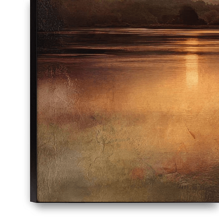 This luxurious wall art captures the moment when the sun gently sinks behind the hills and the landscape is bathed in a warm golden glow. The still water, soft clouds and elegant brushstrokes create a refined, dreamy look. The silhouettes of trees and hills give the whole a calm, natural depth that fits perfectly into modern…