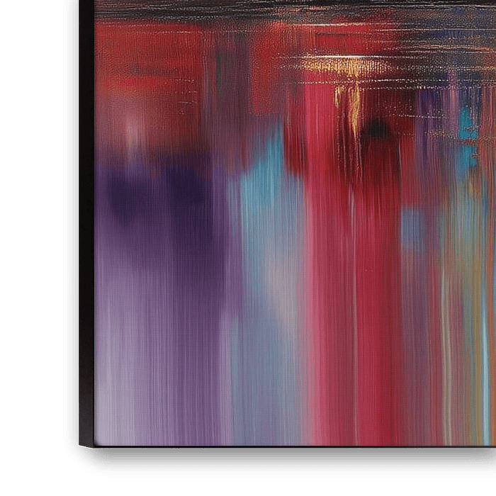 The painting shows an abstract-impressionistic depiction of the London skyline with striking landmarks such as The Gherkin, which can be recognised by its characteristic honeycomb structure on the right-hand edge of the picture. The city skyline stretches horizontally across the entire canvas and is presented in a dynamic colour spectrum of bright yellow, orange, red and turquoise tones, interspersed with cool blue and grey tones and warm violet nuances. In the upper part of the picture, the buildings blur into vertical strips of colour, reminiscent of motion blur or rain, creating an atmospheric, almost mystical mood. The lower half of the picture shows the perfect reflection of the skyline in the Thames, with the colours running downwards and condensing into intense, vertical stripes. The painting style combines realistic architectural elements with free, expressive colours to create an emotional, energetic interpretation of the British capital.