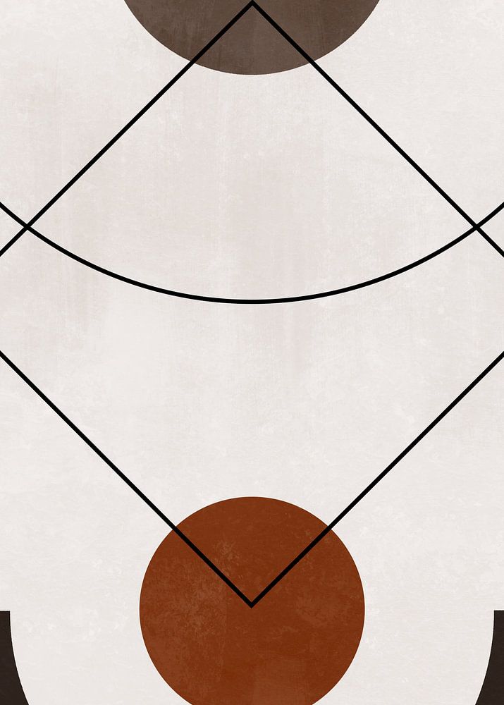 Abstract geometric artwork with circles and squares in the colors brown and terracotta on a beige colored background with subtle texture.