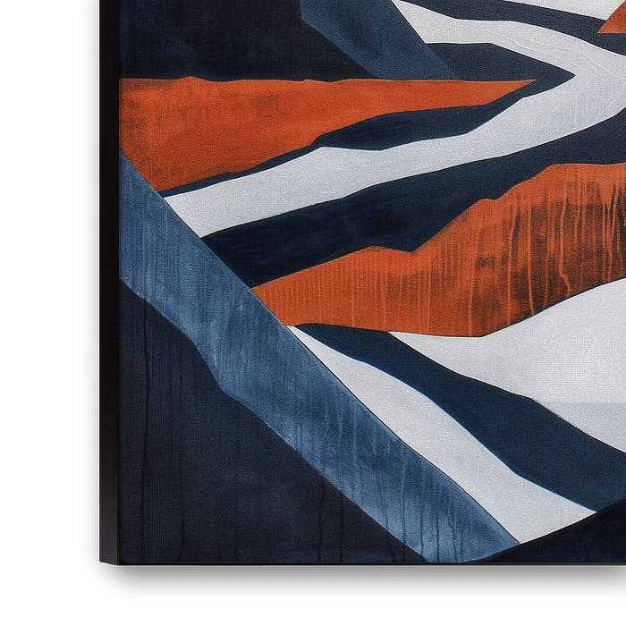 This work depicts an abstract mountain landscape, where sharp, geometric shapes depict the imposing mountains and valleys. The combination of cool blues with warm rust colours creates an intriguing contrast that captures the strength and serenity of nature. The white path winding through the landscape leads the eye into the depths of the composition. This work would look great in a modern office space or living room, where it can bring a sense of adventure and calm.
