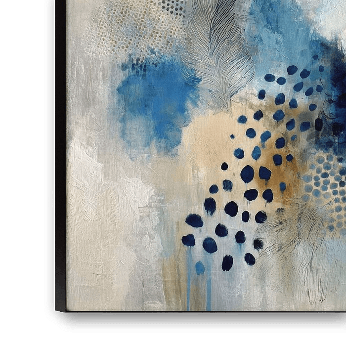 This blue-beige abstract painting with soft shapes and sophisticated textures feels dreamy and elegant. The combination of deep blue nuances, light feather accents and warm sandy tones brings calm and sophistication to any interior.