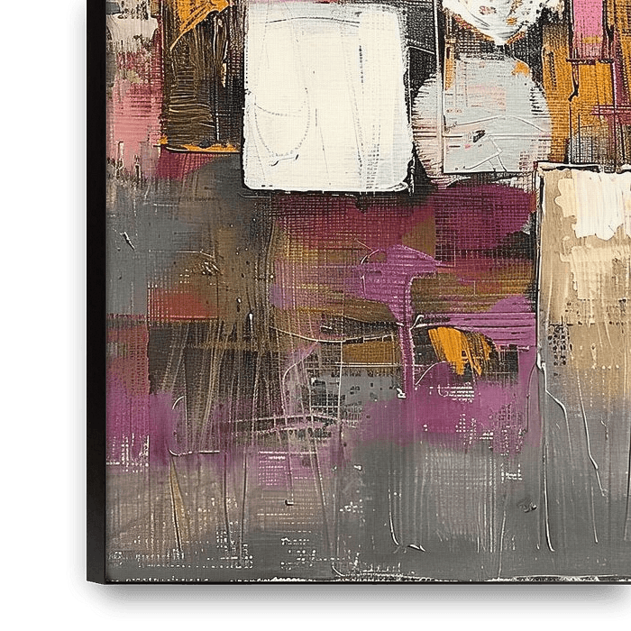 Abstract Painting - This abstract painting shows a dynamic composition of overlapping blocks and shapes in a rich variety of colours and textures. Each shape appears individually treated with a unique approach to paint application, ranging from thick, tactile layers to fine, delicate lines. Shades of pink, mauve, beige, and brown…