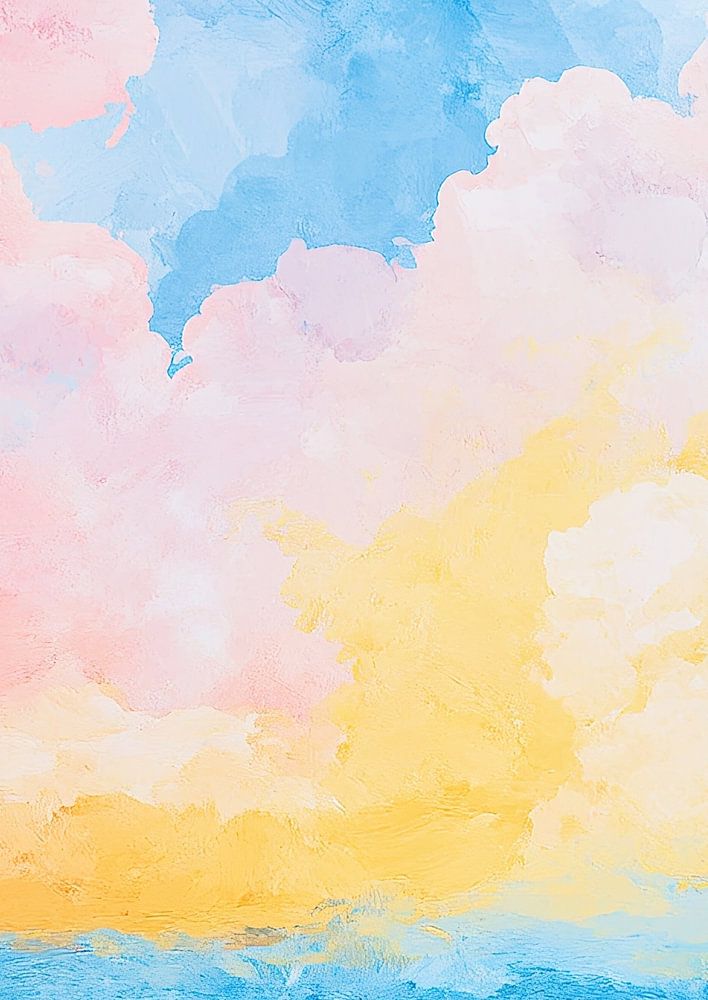 Abstract sky, sea, pastel colours, watercolour style, hand-painted, clouds, blue sea, pink and yellow sky, soft brushstrokes, minimalist background, simple shapes, bright light, calm atmosphere, soft contrast, harmonious colour palette.