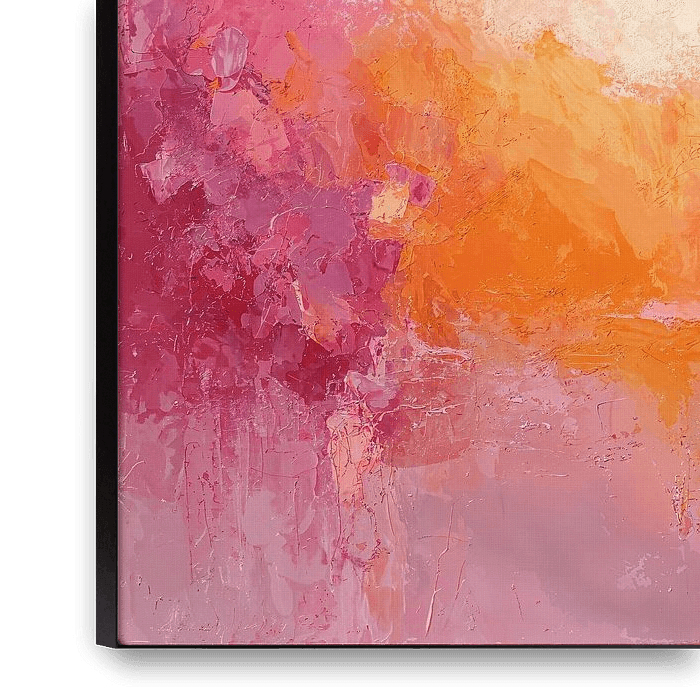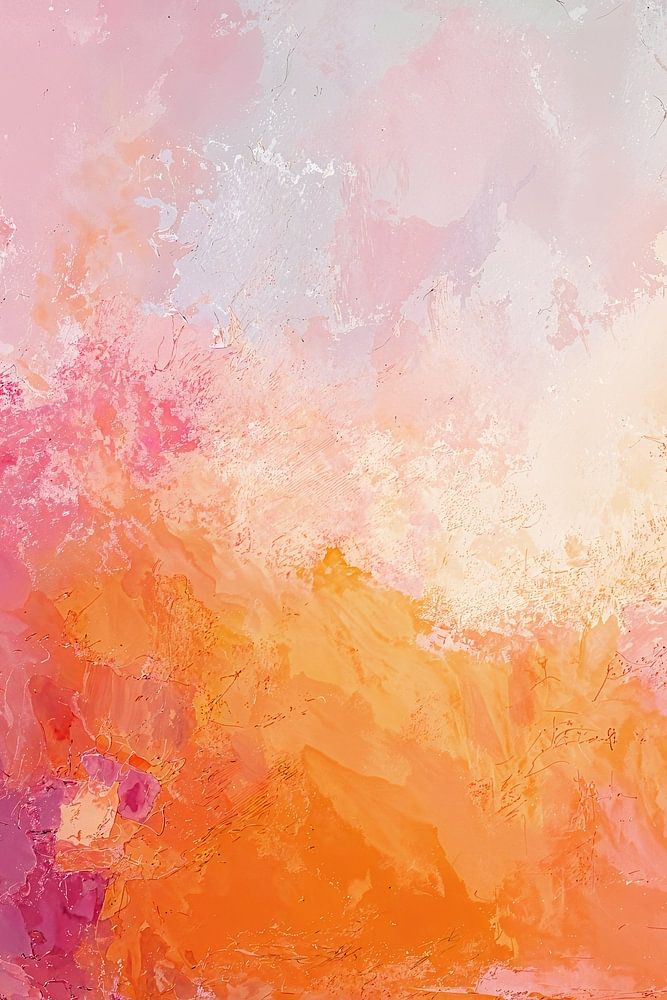 An abstract artwork reminiscent of a dreamy sunrise, where warm coral pink and orange hues blend harmoniously with soft pastels. The dynamic brushstrokes create a sense of movement and depth, while the subtle color transitions evoke a serene, almost meditative atmosphere.