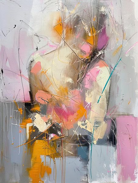 Abstract Woman | Minimalist Abstract Woman with Lines - In this abstract painting, you see a woman with a soft pink hue and intricate lines framing the shapes of her body, surrounded by vibrant colours such as orange and yellow.