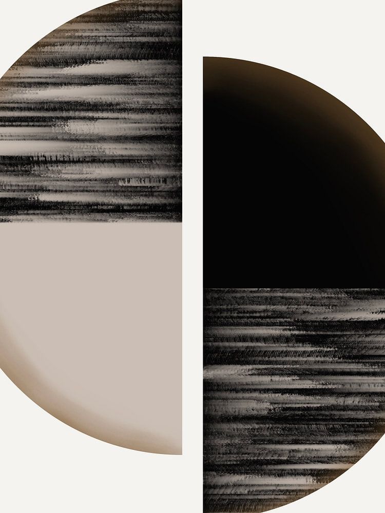 2 half circles with smudges and a golden glow. Abstract modern art with the colors beige, black and gold. Matching the series 'Abstract Art - Black and Gold'.