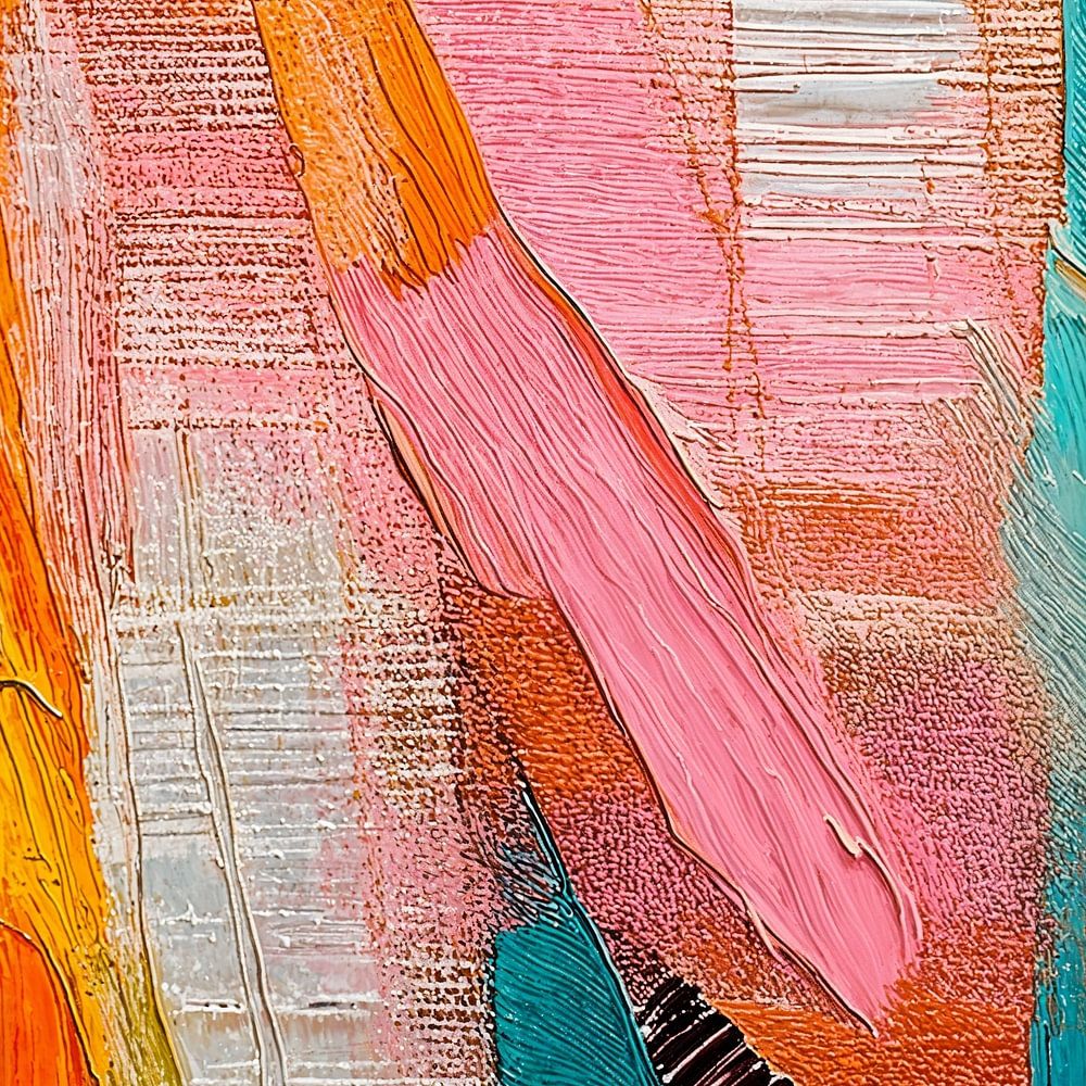A colourful abstract painting with a multicoloured linen textured background dominated by shades of pink, orange and aqua blue.