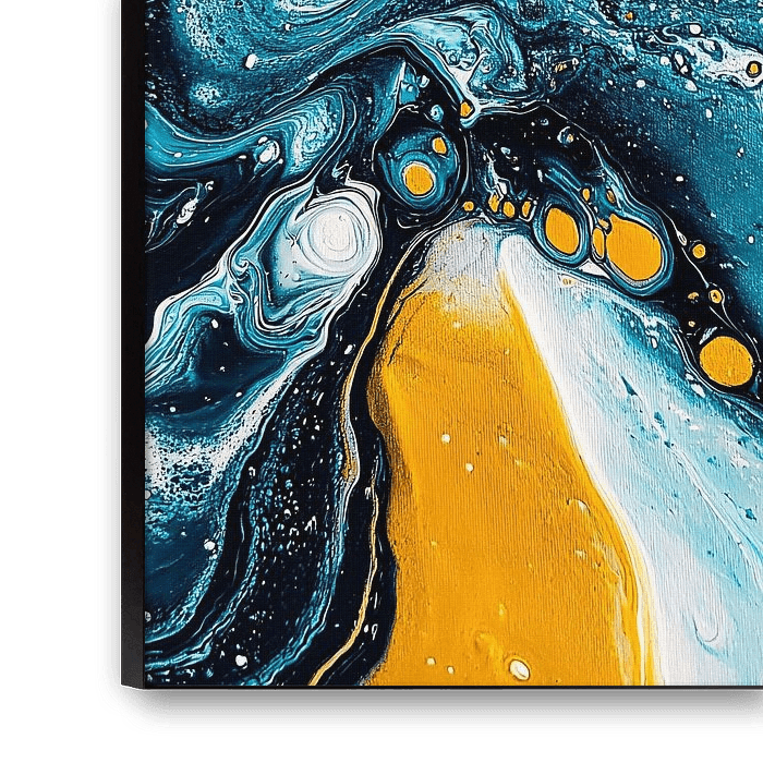 This unique artwork exudes energy and movement through the use of dynamic colours and flowing shapes. It combines vibrant shades of blue with sunny yellow accents, while soft white tones add balance. Perfect for contemporary décor, this design adds a touch of abstract elegance to any room. Ideal as an eye-catcher in a bedroom or office, it inspires creativity and tranquillity. Make your interior come alive with this modern and unique artistic creation.