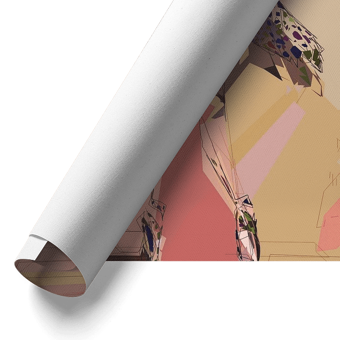 A digital and abstract work in warm tones of a graceful ballerina on pointe is a beautiful contrast between the curves of a dancer and the straight lines of triangles and polygons.