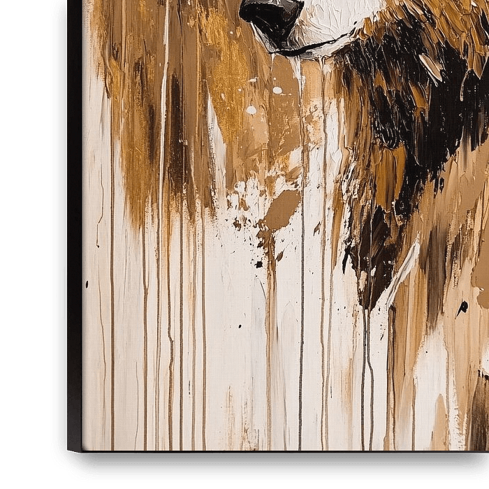 This beautiful artwork shows an impressive portrait of a bear, created with an expressive painting technique. The thick brushstrokes and paint splashes give the painting a dynamic and modern look. The background is abstract with dripping paint streaks, which enhances the sense of movement and adds depth to the scene. The warm colours of…