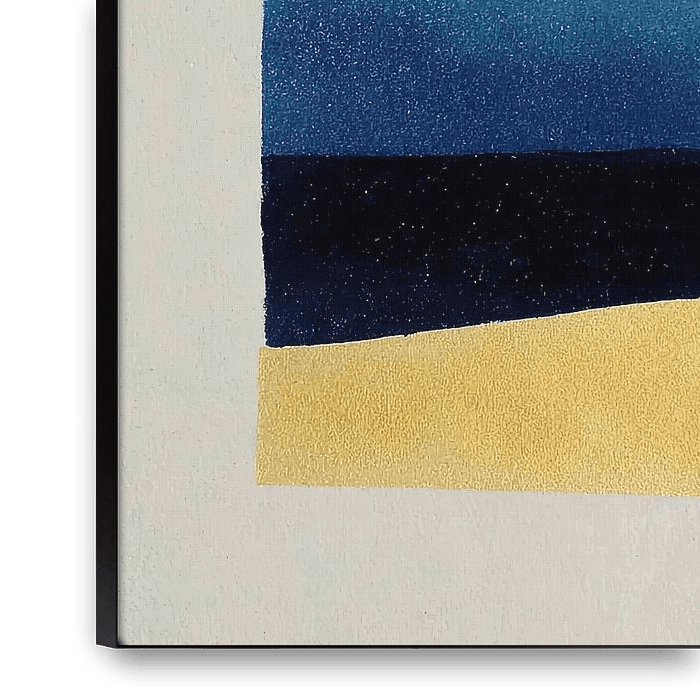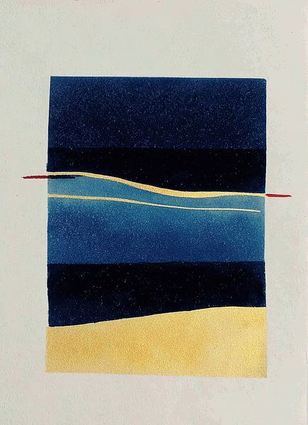 A minimalist composition that captivates with horizontal layers of colour in various shades of blue. A deep midnight blue contrasts with lighter sea colours. A warm, golden yellow area forms the lower border. Delicate golden lines run in waves through the centre, while selective red accents at the edges create visual tension. The work…