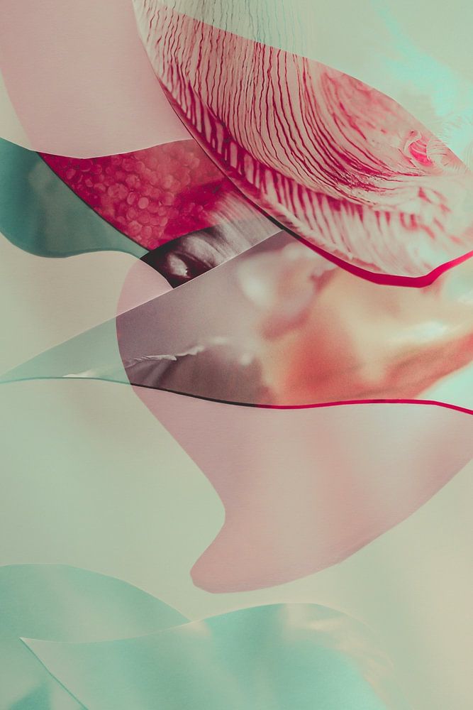 This artwork is a collage I built from my own photos's and coloured paper. I started with analogue cutting of the shapes and then edited the collage digitally (mixed media). My inspiration is nature and its organic shapes. The work contains soft pastel shades in aqua, beige and pink. The work is abstract and therefore everyone can see what they want in it. An asset for your interior.
