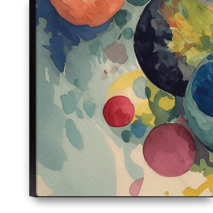 This modern artwork features a dynamic arrangement of colourful circles that appear to float freely in space. Bold shades of yellow, red, blue and green blend with flowing colour gradients to create an energetic, playful atmosphere. The abstract design conveys movement, creativity and joie de vivre, making it ideal as a modern…