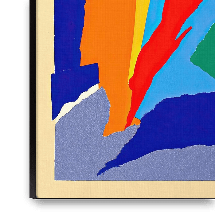 This composition combines vibrant colour fields with sharp-edged, organic shapes. A bold red runs diagonally across the image, flanked by a deep blue background and bright accents in orange and mint green. In the lower section, a dark, textured shape contrasts with lighter shades of blue. The layering of colours creates a dynamic depth…