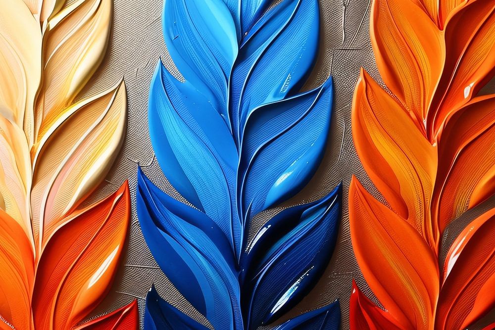 This design offers a unique and vibrant addition to any interior. The brightly coloured leaves in different shades of orange, blue and beige create a dynamic and modern look. The artwork exudes energy and creativity, making it a perfect choice for spaces such as a bedroom or office. The detailed and polished finish of the leaves contrasts beautifully with the rough background, creating an interesting visual balance. This piece can be a great focal point in a room and can easily complement different decor styles, from minimalist to eclectic.
