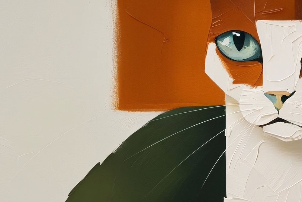 This design combines the soft, recognisable lines of a cat with bold geometric shapes and vibrant colours. The unique use of colour, from soothing shades of white and green to vibrant orange and blue, makes this piece a striking piece that feels both modern and minimalist. Ideal for a space where a calm yet characterful atmosphere is desired, such as an office or bedroom. The combination of abstraction and recognisable shapes creates a balance between playfulness and serenity, making the painting a versatile addition to a variety of interior styles.