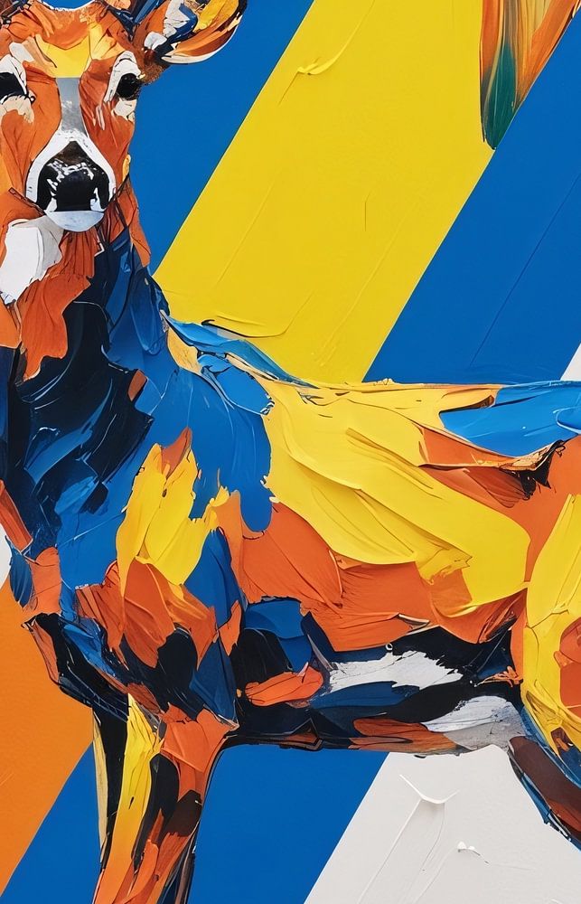 This vibrant artwork brings to life a beautiful deer in a modern, abstract style. With a dynamic palette of bright colours such as blue, orange and yellow, the design immediately catches the eye. The deer is rendered with coarse brushstrokes that exude movement and energy, while geometric shapes in the background add a contemporary feel. This combination of animal elegance and abstract art creates a unique atmosphere that fits perfectly into modern interiors. Whether hung in a living room or office, this artwork brings colour and creativity to any space.