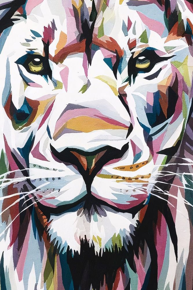This beautiful abstract representation of a lion exudes power and dynamism. The unique combination of vibrant colours and geometric shapes makes this design a real eye-catcher in any interior. The painting brings an artistic mix of energy and serenity, perfect for those who love eye-catching art. Whether you place it in your living room, office or bedroom, it will instantly transform any space. This modern style adds a contemporary feel that never goes out of style. The vivid details and creative interpretation of the subject make it an ideal piece of art for lovers of colour and abstraction.