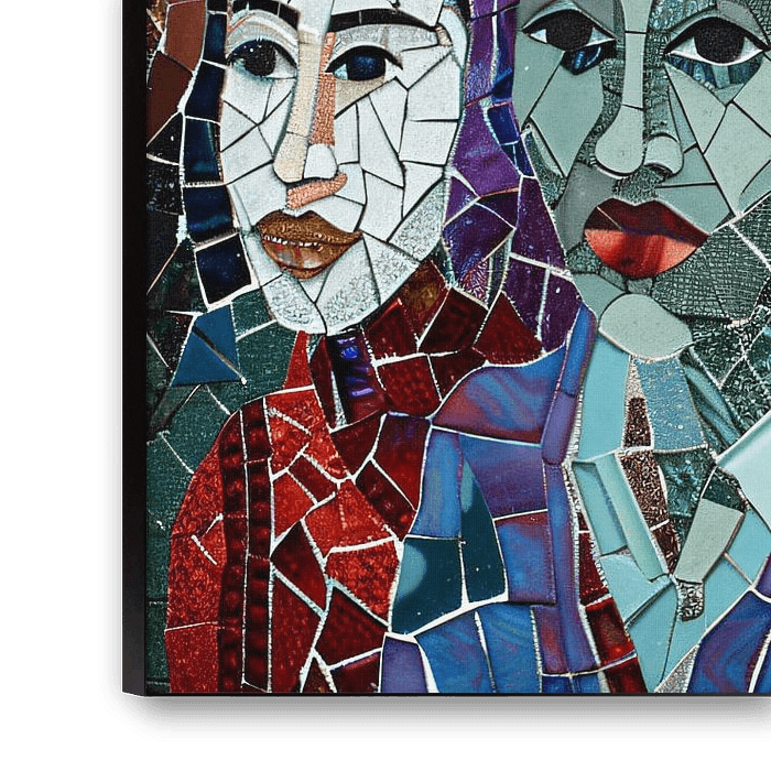 This striking mosaic portrait shows a vibrant array of faces, each made up of colourful pieces that together form a harmonious yet dynamic composition. The versatility of colours and shapes highlights the diversity and uniqueness of each individual, while the abstract style gives it a modern and eclectic look. Perfect for spaces where…
