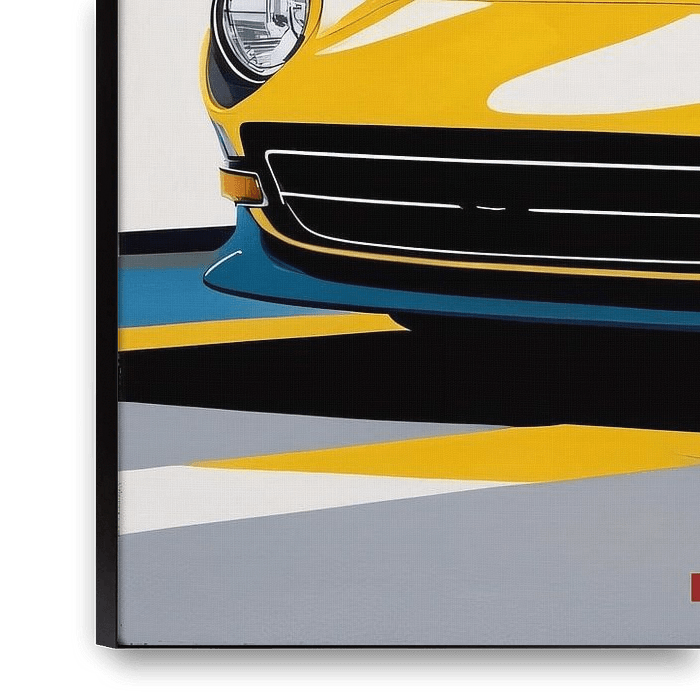 This vibrant and modern design depicts a streamlined classic car in an abstract art style. The use of bright colours such as yellow, blue, and red gives it a dynamic and energetic look. The geometric shapes and clean lines are reminiscent of the pop art movement and create a unique, contemporary image that would fit perfectly in a…