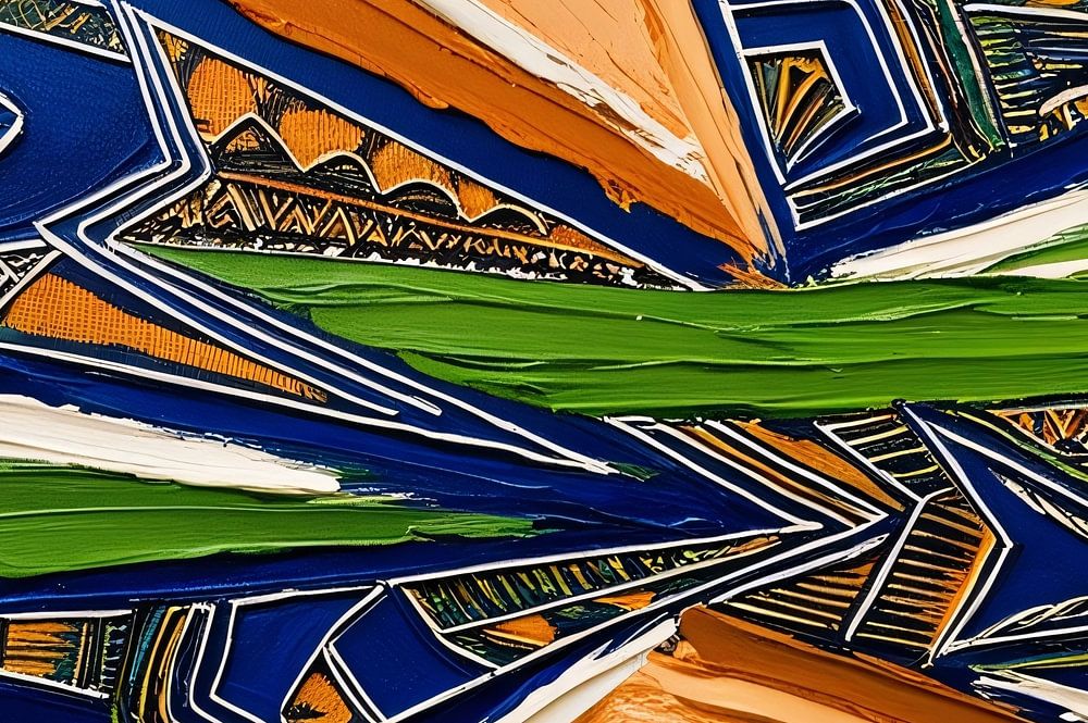 This unique abstract artwork combines tribal patterns with a vibrant colour palette of blue, green, orange and white. The bold brushstrokes and dynamic lines create an energy that is instantly striking. The design is a perfect blend of modern abstraction and traditional influences, making it both versatile and captivating. This painting would make an impressive focal point in any interior, whether placed in a living room or an office. Its vibrant colours and strong contrasts give any room a fresh, dynamic feel and are sure to spark conversation. A real eye-catcher for lovers of modern art.