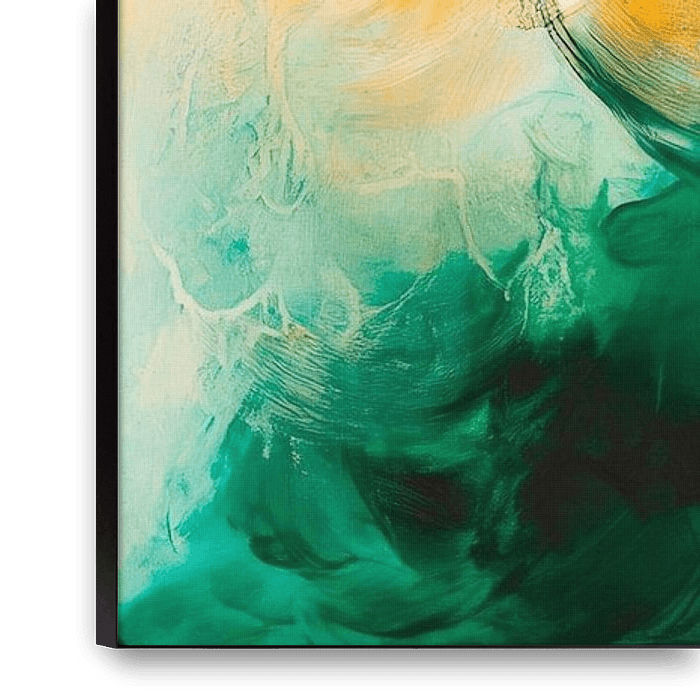 The soft green tones, paired with lively yellow accents, conjure up a harmonious atmosphere reminiscent of fresh, unspoilt nature. The flowing transitions and dynamic structures invite calm and inspiration. Perfect for the living room, where it can stimulate conversation and create an inviting atmosphere.