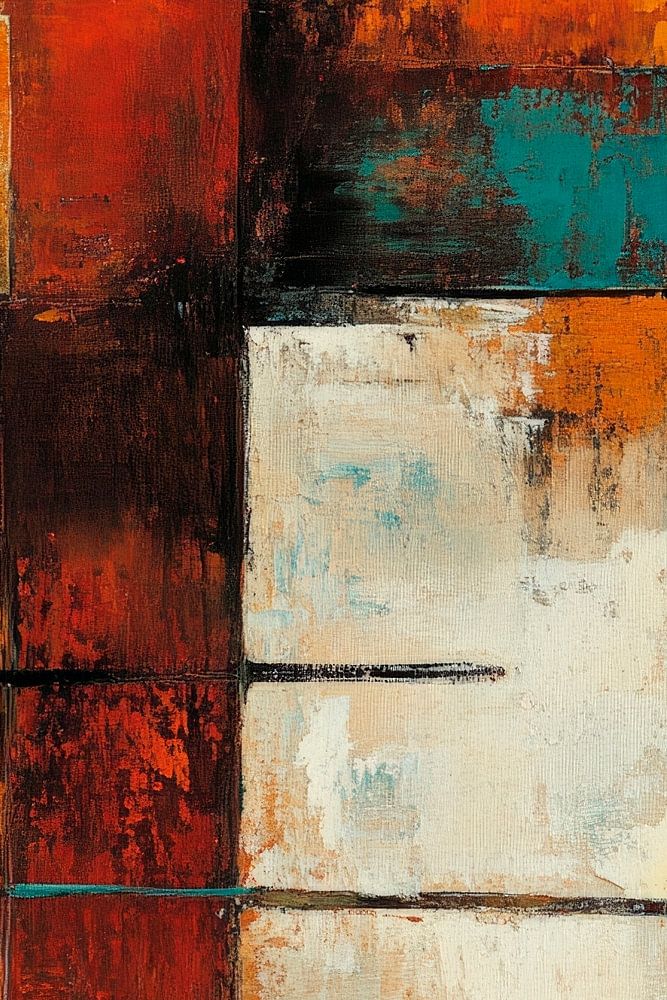 An interplay of warm earthy tones and cool accents creates a fascinating balance. The dynamic, structured lines convey energy and movement, while the soft background radiates calm. Ideal for the living room to stimulate conversation and create an inviting atmosphere, or for the office to encourage creative thinking.
