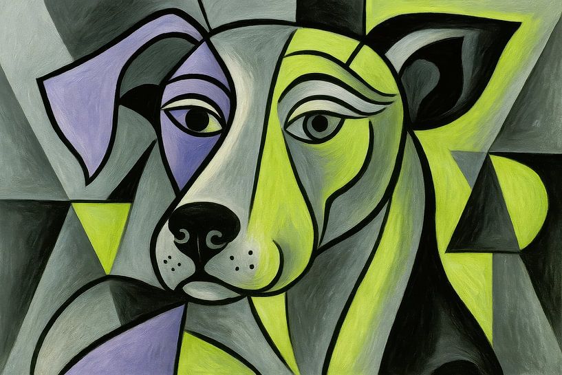 This cubist dog portrait captures a dog with powerful geometric shapes and playful planes. Large triangles, curved lines and tight contours alternate, while purple and green contrast vividly against soft greys. While one eye looks calm and focused, the other is framed by rhythmic tessellations, creating depth and balance. Black lines…