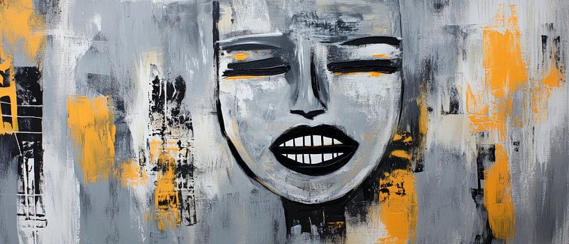 A powerful interplay of black, grey and vivid yellow unfolds here, while an expressive face with closed eyes radiates a mysterious calm. The dynamic combination of geometric elements and intense colours gives this work of art a modern touch. It is ideal for a creative living room where it can stimulate conversation.