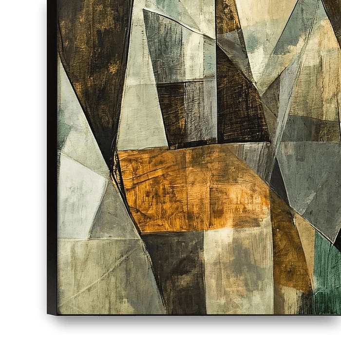 This abstract artwork depicts an intriguing portrait of a woman in cubist style. Warm tones of brown, gold and green are combined with subtle black and white accents, creating a unique atmosphere. This design fits perfectly into modern interiors and adds a touch of sophistication and artistic flair to any room. Ideal for the bedroom or…