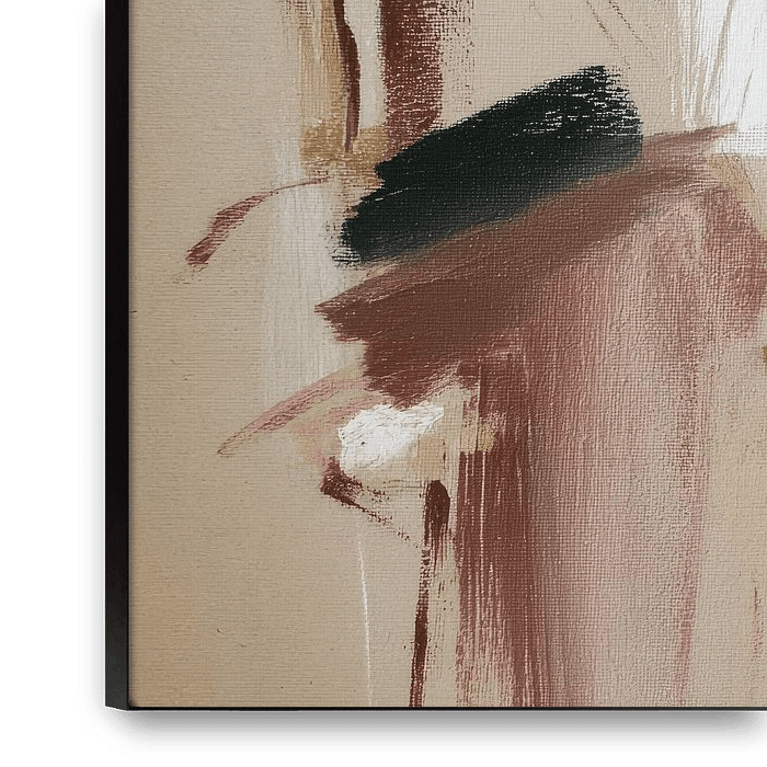 An understated, abstract figurative work that feels like a whisper on linen. The female form is composed of loose, expressive brushstrokes in warm beige, powder pink, rust and off-white. The face is deliberately left open and unfilled, giving you, the viewer, plenty of room to put your own story into the image. It is precisely this…