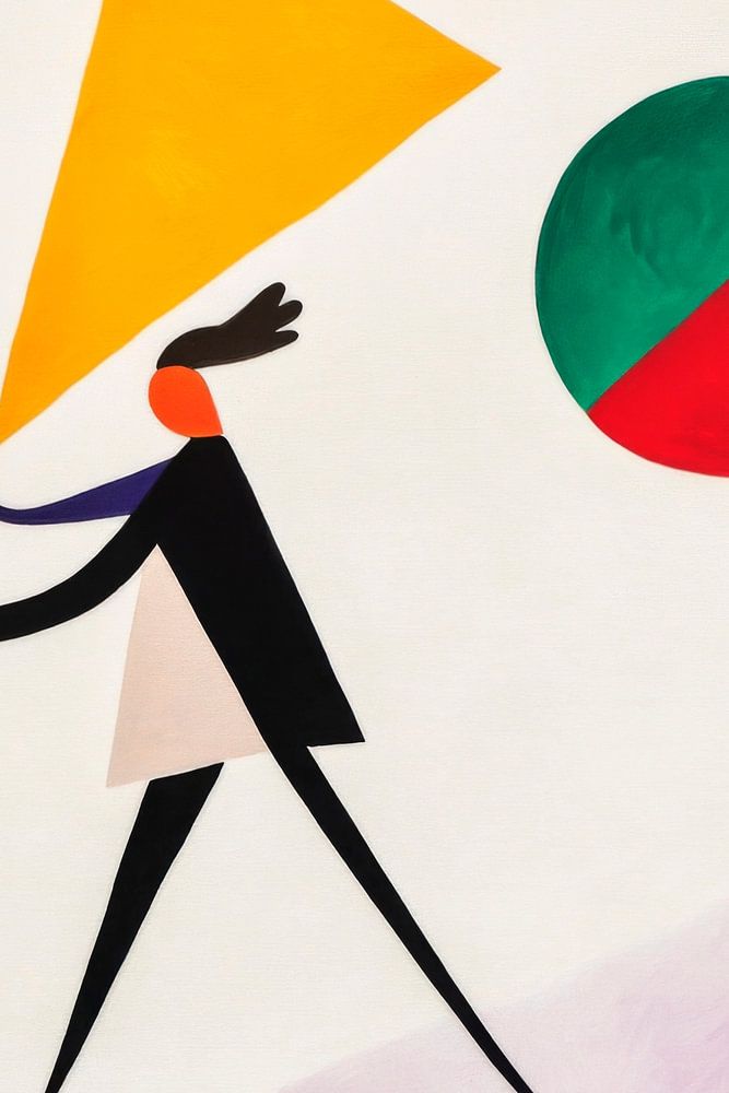 A dynamic figure in stylised movement, whose head is adorned with a bright yellow cone, creates excitement. Surrounded by lively geometric shapes and vibrant colours, a harmonious composition unfolds. The black and colourful elements dance in the pictorial space and lend the scene a playful, almost dreamlike atmosphere.