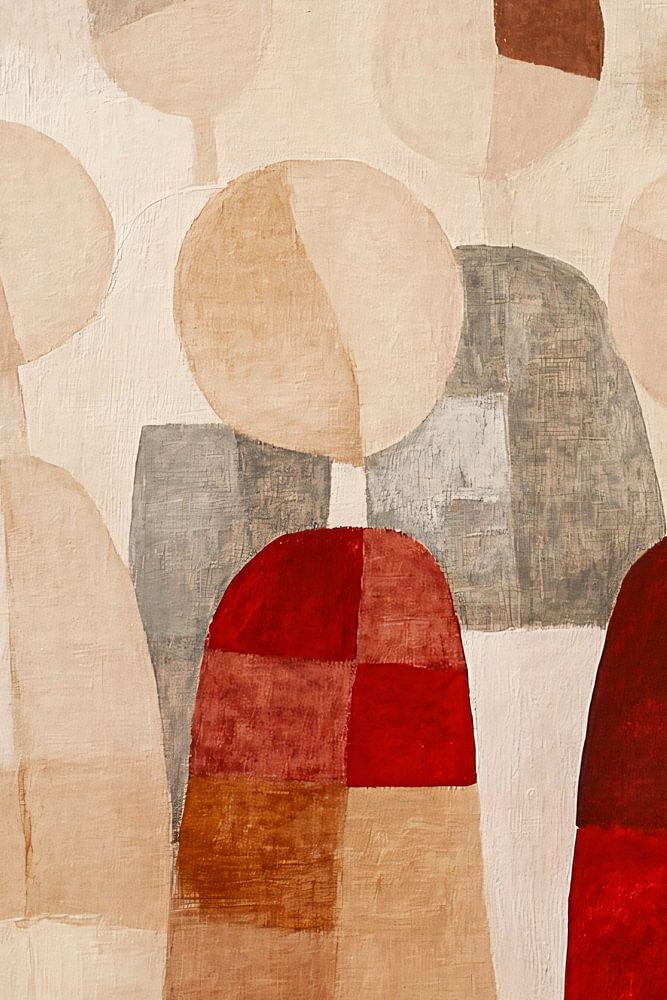 This unique design is a wonderful example of minimalist art, where abstract shapes come together to create a subtle yet powerful composition of human figures. The subdued colours such as beige, red and brown create a serene atmosphere that fits perfectly into modern interiors. The design exudes simplicity, but also contains a depth that leaves room for interpretation. Ideal for a bedroom or office, this painting offers a sense of calm and balance. It is a timeless addition that adds harmony and style to any space.