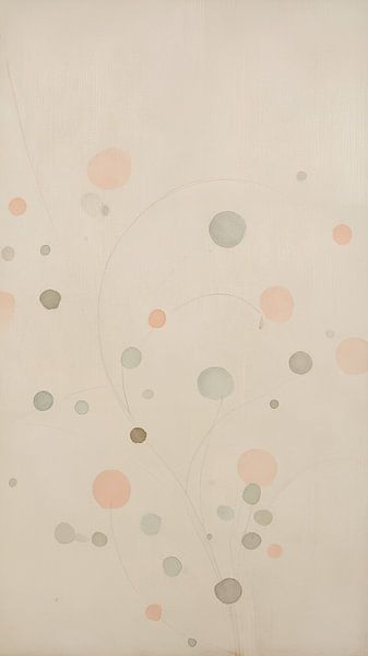 Against a creamy white, finely textured background, delicate abstract blossoms float in shades of peach, dusky pink, mint green and warm grey – connected by gossamer-thin, pencil-fine lines that form sweeping arcs and curves. The composition is reminiscent of flowers. The blossoms vary in size and intensity: some are bold and clearly…