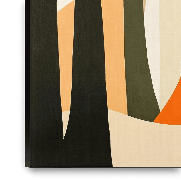This beautiful abstract artwork offers a rustic representation of a forest in minimalist shapes and warm autumnal tones. The design exudes simplicity and harmony, with bold colours such as orange and black contrasting against soft beige and green tones. Perfect for modern living spaces, this painting adds a touch of nature and…