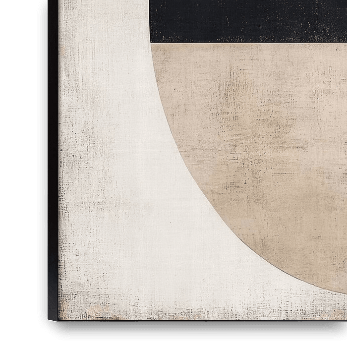 A harmonious interplay of geometric shapes unfolds before the viewer. A large semicircle with an elegant edge is accompanied by a small dot and light, subtle textures. Black and beige dance in contrast, while the calm, neutral canvas creates a space for interpretation and symmetry. The composition radiates creativity and balance.